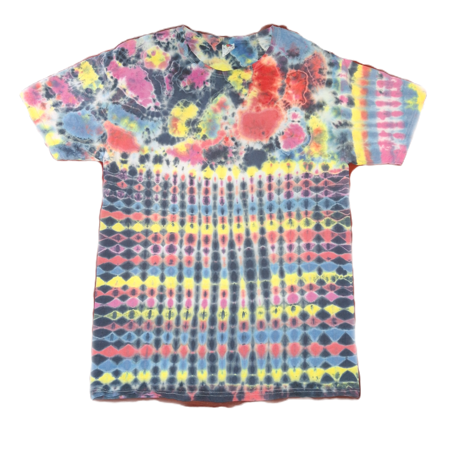 This t-shirt bursts into a colorful explosion and dots across the entire piece.