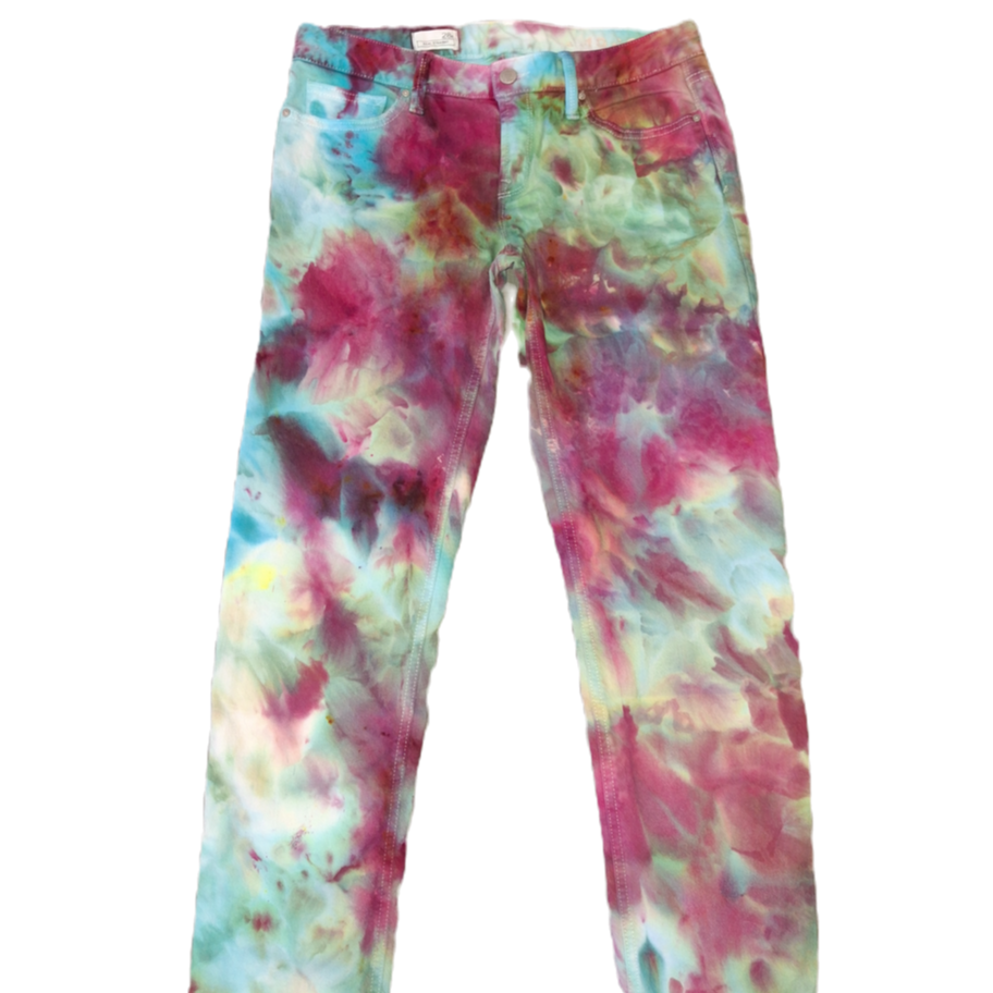 This pair of expertly handcrafted tie-dye jeans are designed to dazzle! These jeans will leave everyone in your trail in a daze with the vibrant, flowing colors, perfectly capturing our passion for individuality and creativity.