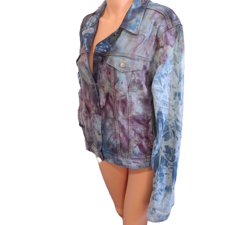 This waistlength denim jacket features dark flowing patterns, hand-tied and dyed to perfection.