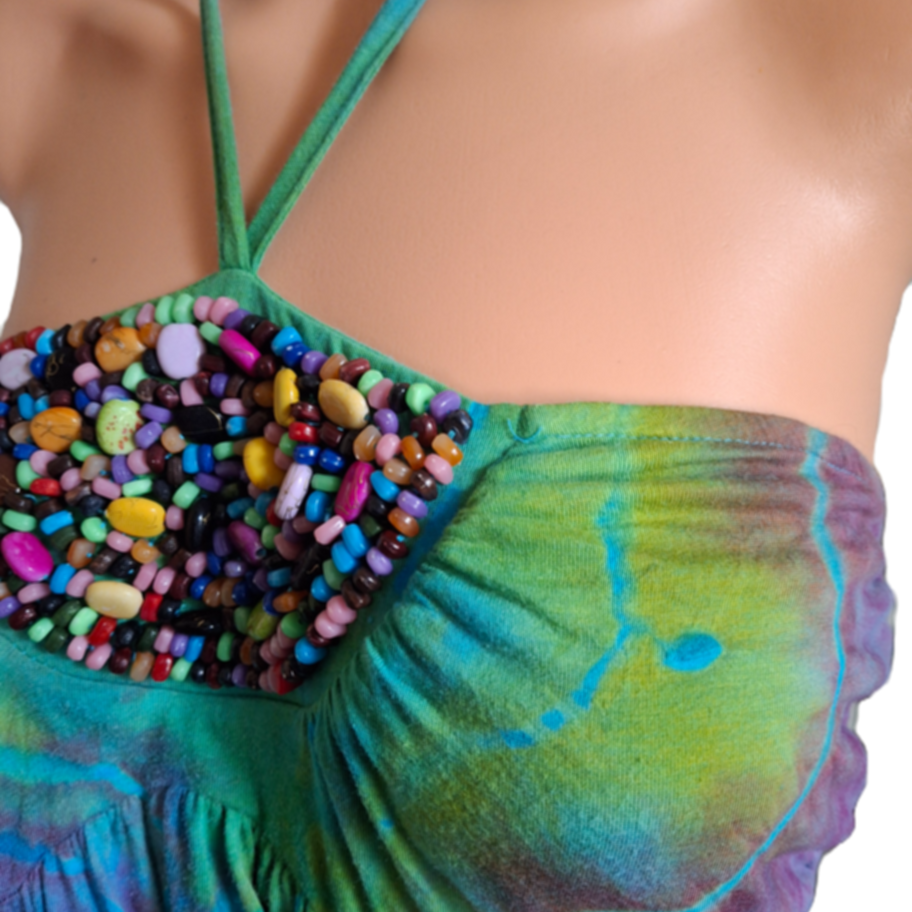 This reverse ice dye dress with beadwork is a true masterpiece, designed to ensure you stand out in a crowd.