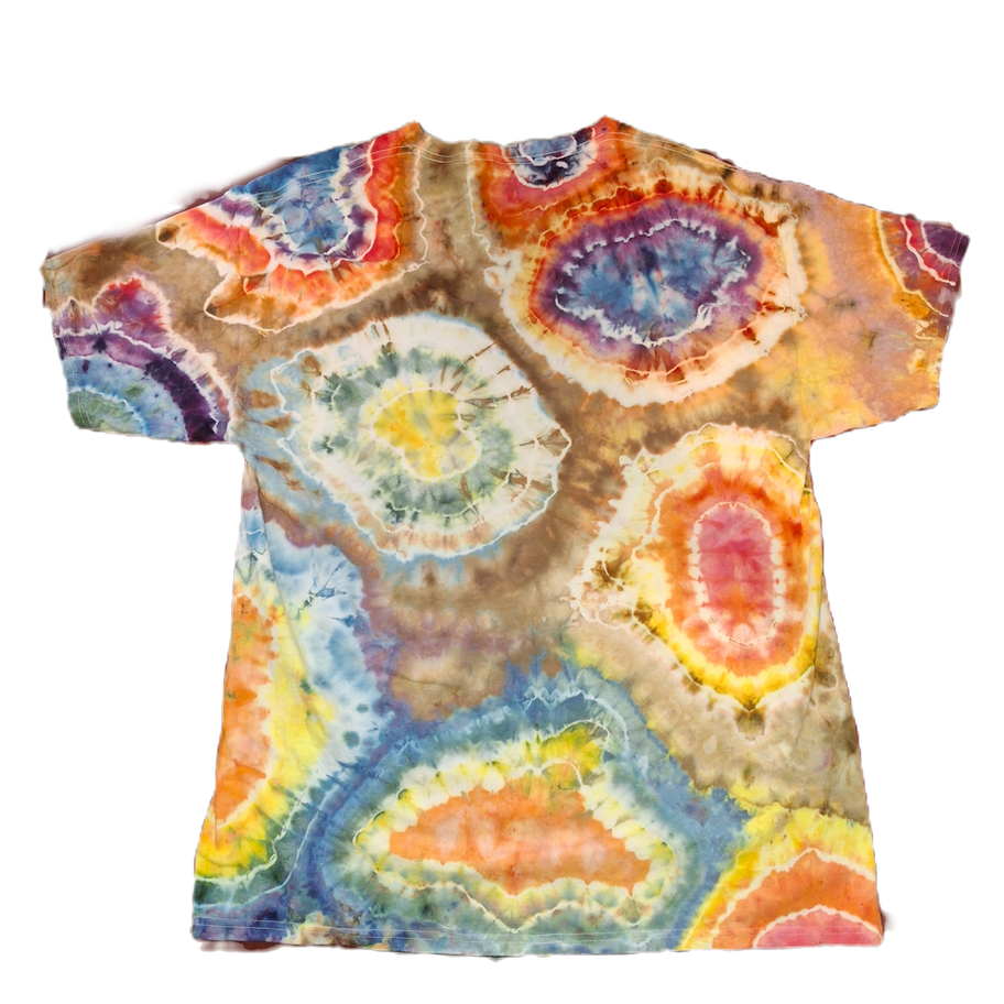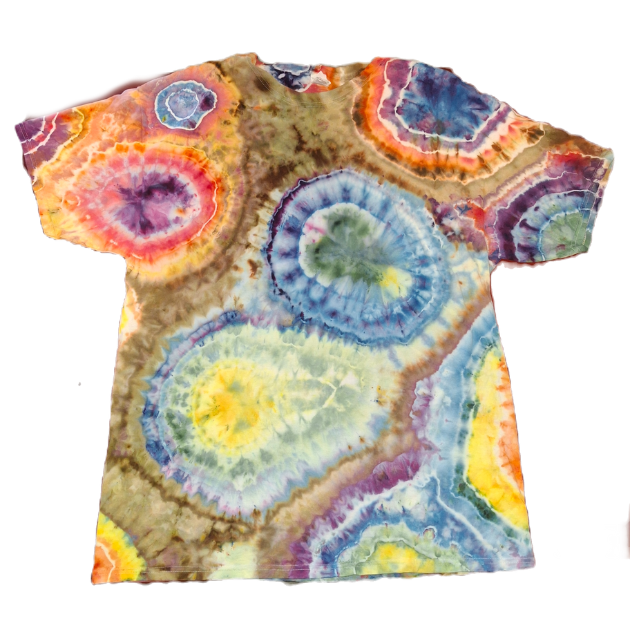 A combination of earthy and bright rainbow colored hues come together in this stunning tie-dye pattern. Perfect for nature enthusiasts and style aficionados alike.